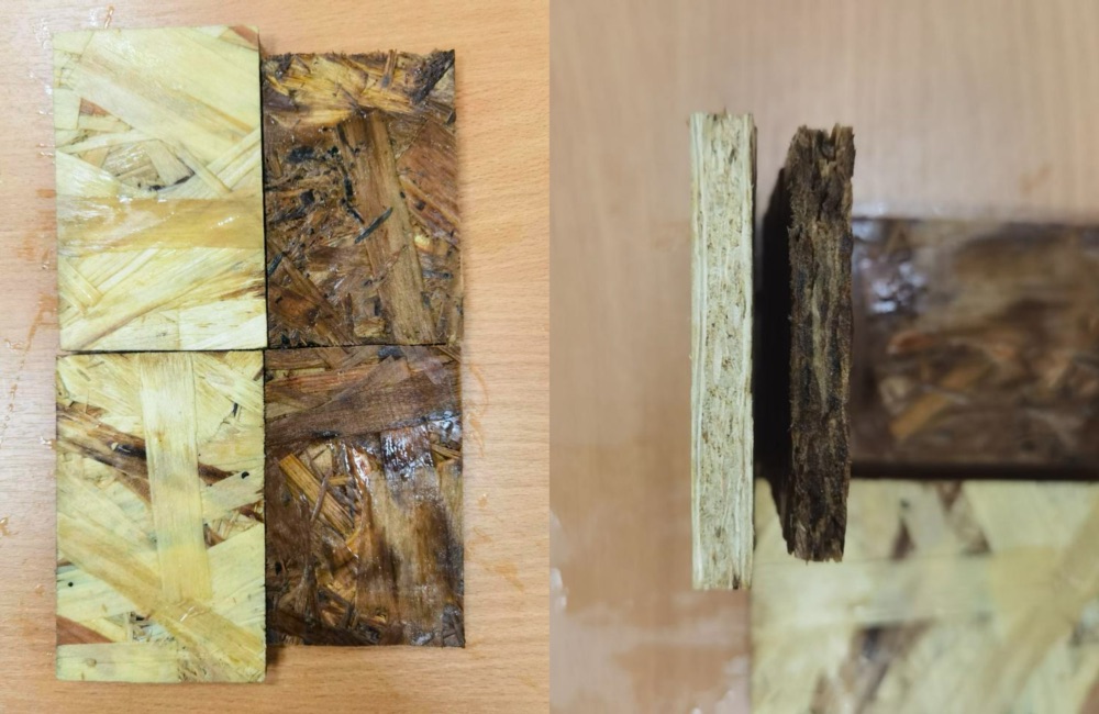 Но сначала замерили геометрию. Темный образец потерял форму, расслоился, сначала разбух, а потом рассохся. Все что от него осталось, пришлось быстро предать земле. Муромский OSB сохранил цвет и форму. Запахами не пугал, и стойко выдержал суровое испытание.